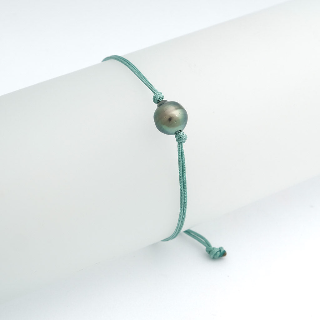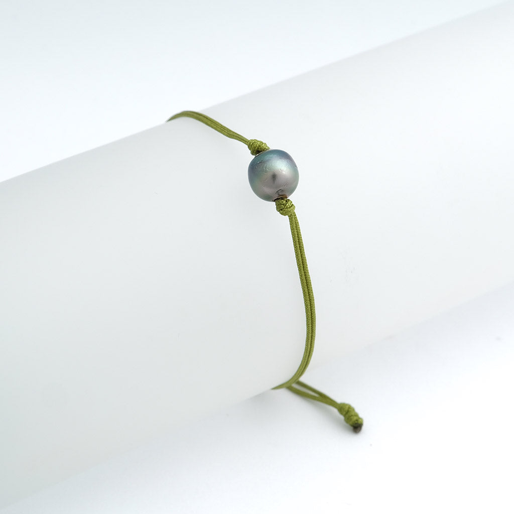 Eine schillernde Tahitiperle in einem Zugband aus farbigem Nylon - so schmiegt sich das Armband 'Mora‘ aus dem atelierCK unkompliziert an den Arm.