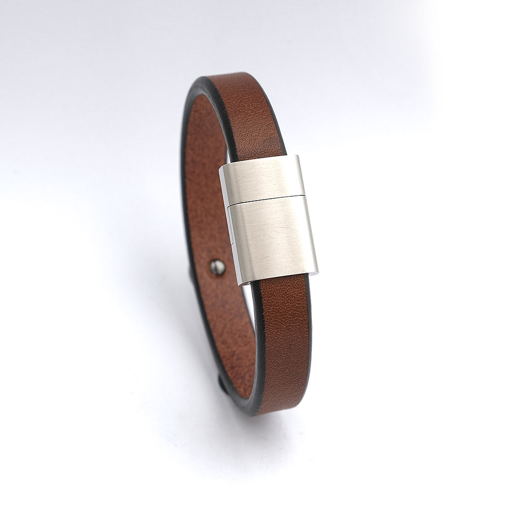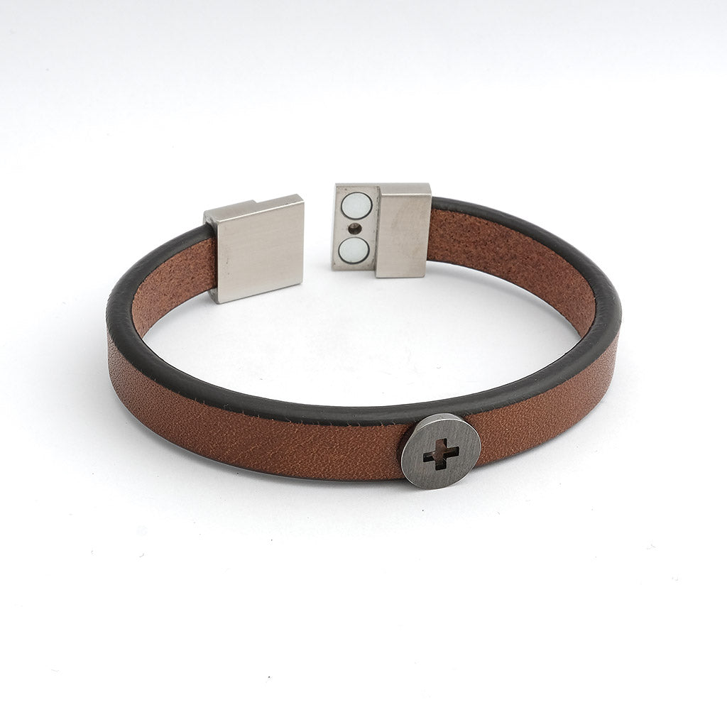 Das Lederarmband aus der Intention-Serie von 'noen' trägt eine silberne Platte mit dem Symbol Kreuz 'Power' Kraft und Ruhe liegen in der Verbindung aller Elemente.