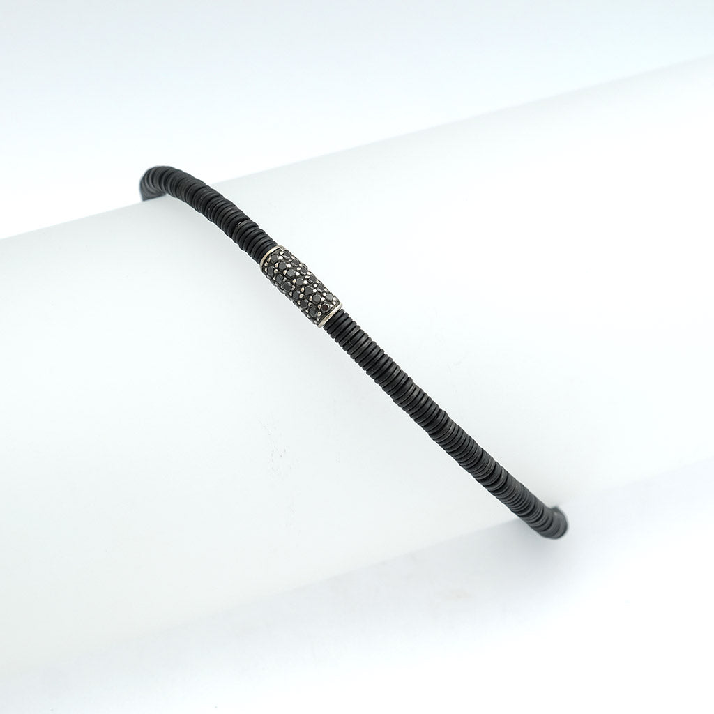 Perfekt für den Mann - unaufdringlich, sportlich, elegant. Ein dezent glitzerndes Element mit schwarzen Diamanten zwischen matt-schwarzen Keramik-Scheibchen. Die dehnbaren Zug-Armbänder 'MUSA' von Roberto Demeglio lassen sich ohne Verschluß unkompliziert überstreifen. Die erprobte Technik garantiert die Haltbarkeit.