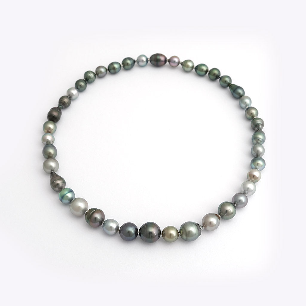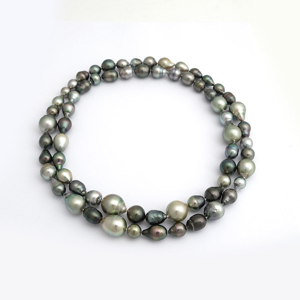Dieses Collier aus barocken Tahiti-Zuchtperlen kann in 4 Varianten getragen werden. Mit zwei integrierten Schließen läßt es sich nach Wunsch verwandeln: als lange Kette, einzeln als kurzes oder längeres Collier oder doppelt ineinander gelegt. Die Komposition aus Tropfen und runden Perlen in unterschiedlichen Größen und Farben macht die Kette zu einem ganz besonderen Einzelstück.